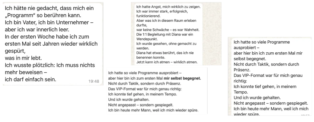 Diana ist Gründerin eines der kraftvollsten Männerräume im deutschsprachigen Raum. Sie begleitet Männer in echten Transformationsprozessen und gestaltet Formate, die weit über klassische Persönlichkeitsentwicklung hinausgehen – leise, ehrlich, präsent.